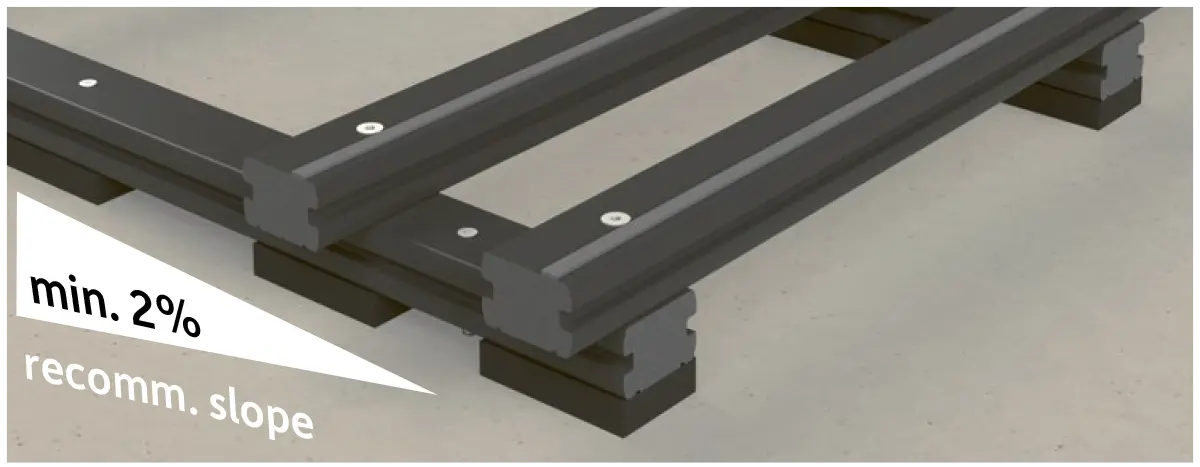 A min. 2 % longitudinal gradient of the board is compulsory with an elevated design of min. 161 mm, as is an adequate ventilation from below and the rear respectively (e.g. use of ventilation grilles, keeping distance from rhombus profiles).
