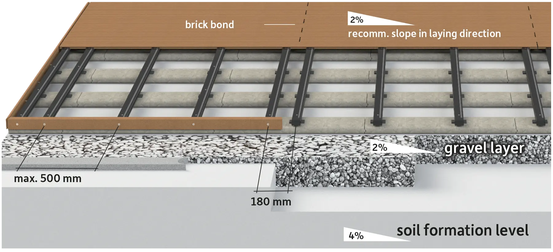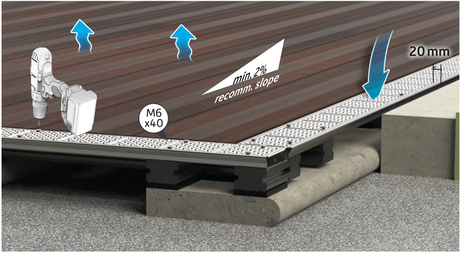 • The ground-level deck can be designed with a closed gap if the construction height of 161 mm or more, a minimum longitudinal slope of 2% and a circumferential ventilation grille or other structural measures for sufficient under- or rear-ventilation are strictly adhered to.