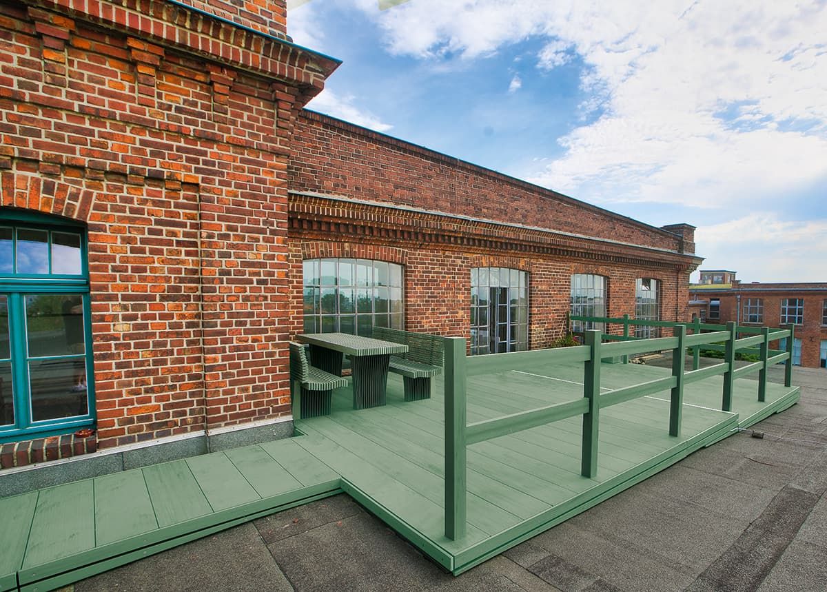 tovární střechy. Kdysi tady kvetla pažitka a černý bez, než vyrostly břízy ve spodních podlažích a střešní zahrádka musela ustoupit. K vyrovnání byla tehdy instalována dřevěná terasa.