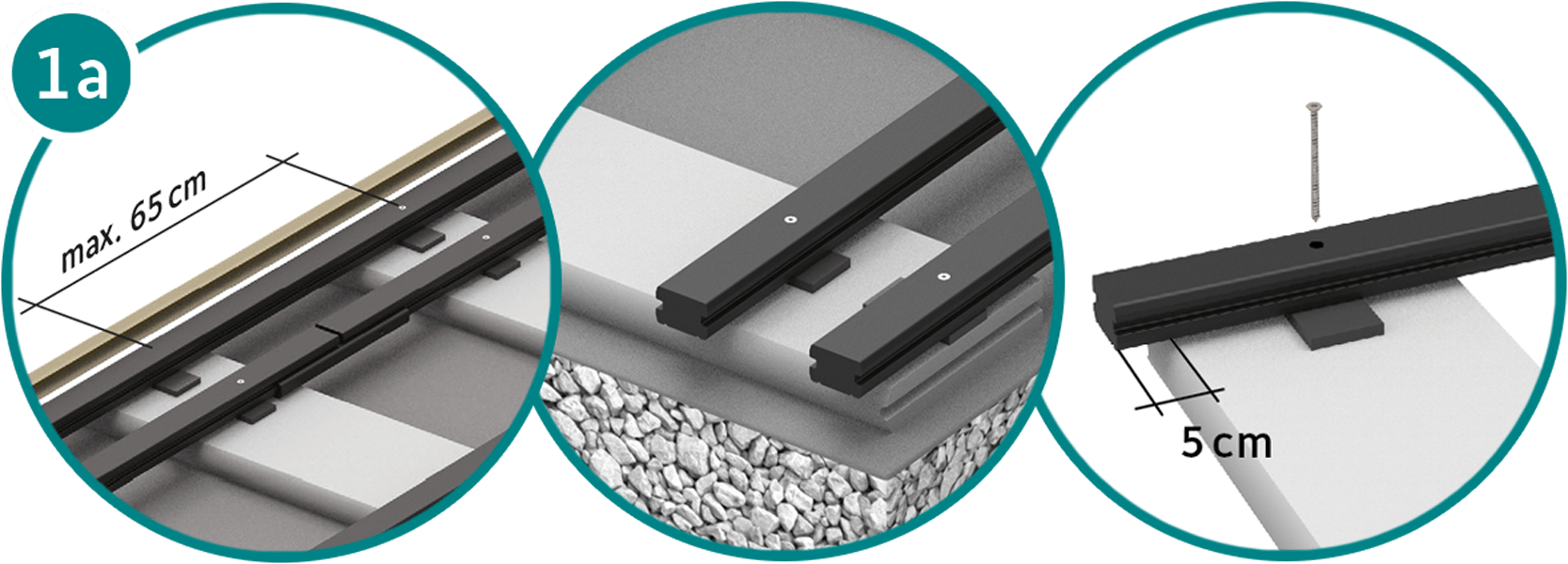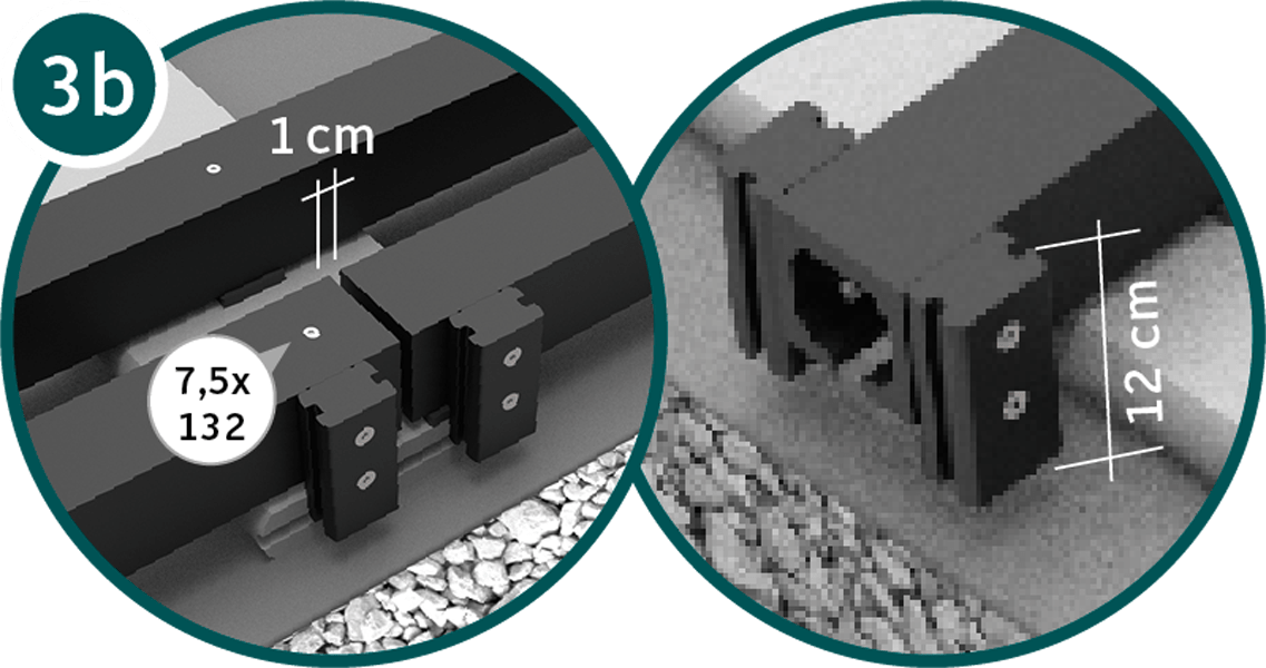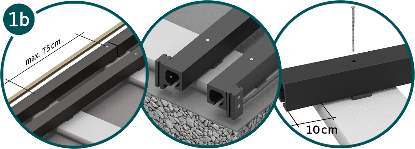 Betonrandsteine (100 x 25 x 5 cm) im Achsabstand von 750 mm auf Gefälle-Kiesbett verlegen, stirnseitig zu Konstruktionsbalken 100 mm nach innen versetzen.
