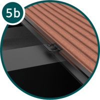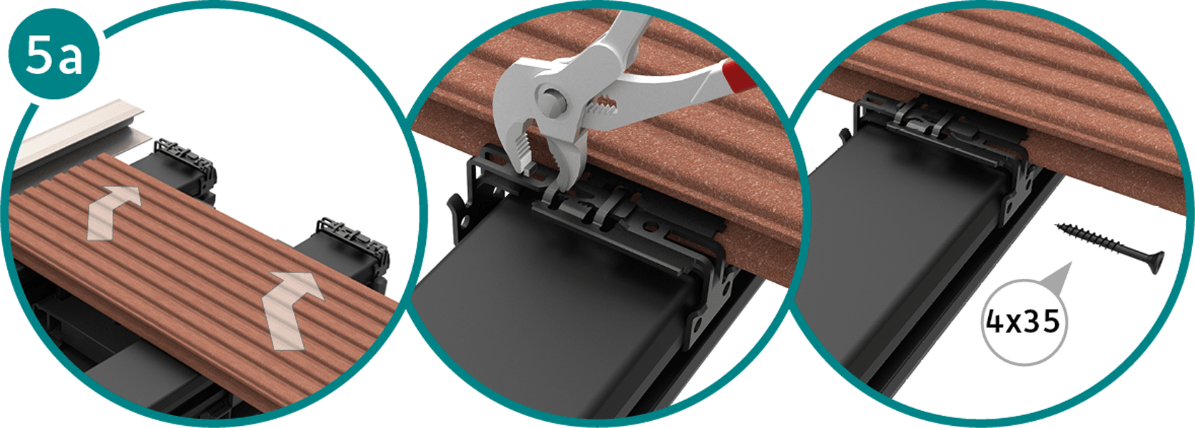 - Nach Montage der ersten Dielen Hausanschlussprofil als Abschluss- leiste zur Hausfassade auf Dielenende schieben (optional). Mit Clip Dielen fixieren. Schraube so anziehen, dass Clip parallel zur UK steht.