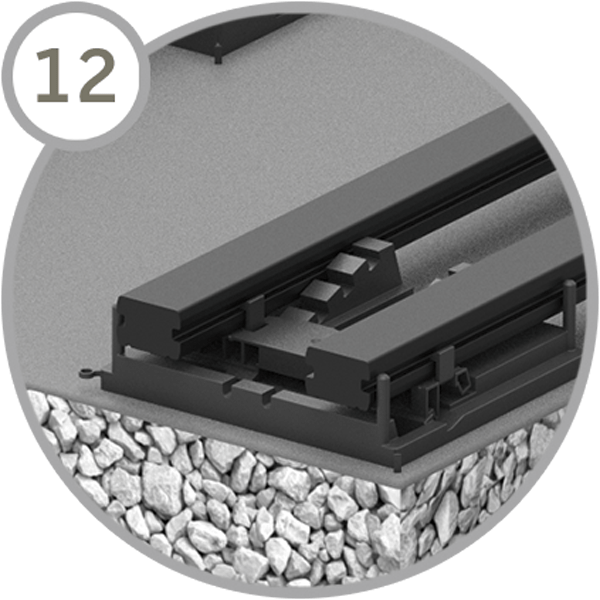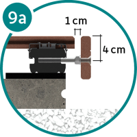 Konstruktionsbalken (90 x 90 mm) gleichmäßig quer zu den Betonrandsteinen verteilen, 100 mm Überstand beachten. - Am Anfang und Ende jeweils zwei Balken anordnen. 10 mm Gummipads unter die Konstruktionsbalken legen, evtl. Gefälleunterschiede mit weiteren Gummipads ausgleichen.