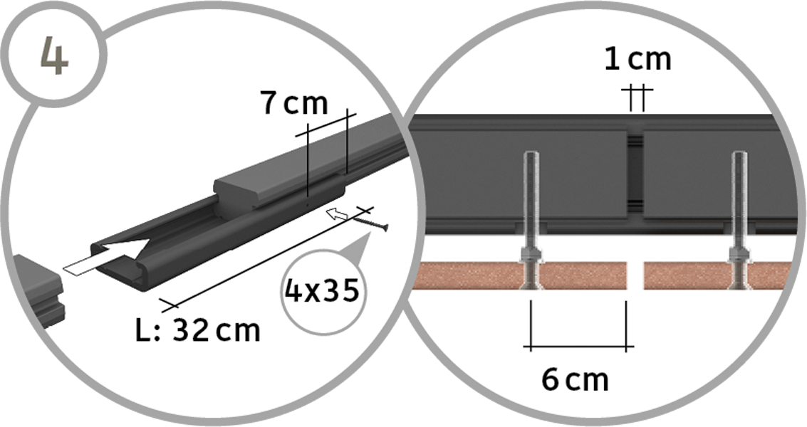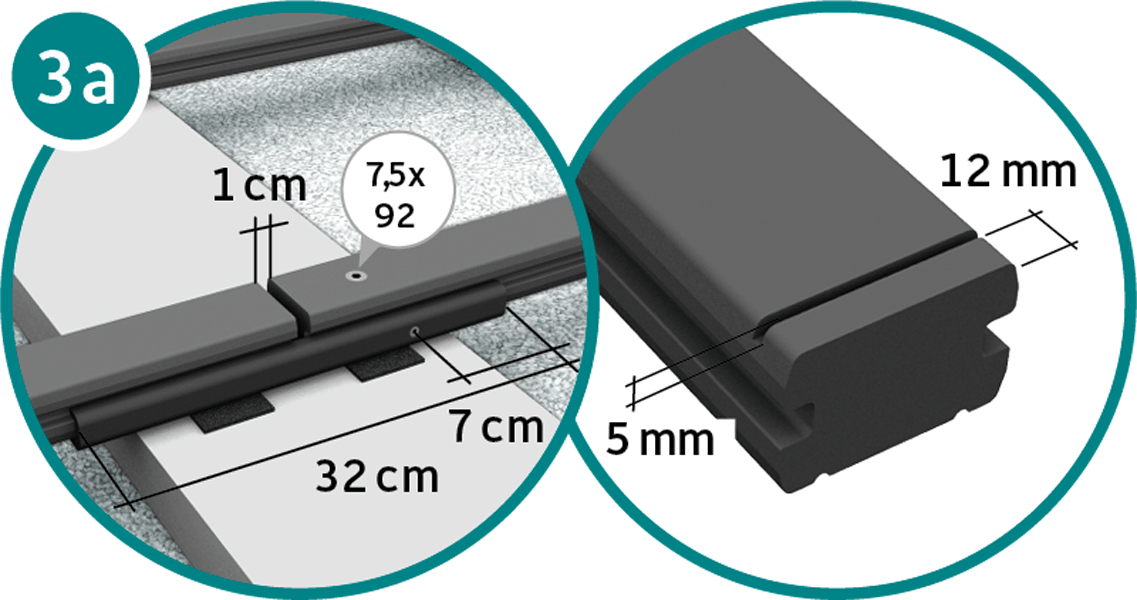 - Rispenband unterhalb der Konstruktionsbalken platzieren und mittels Montageschuh an allen Konstruktionsbalken verschrauben.