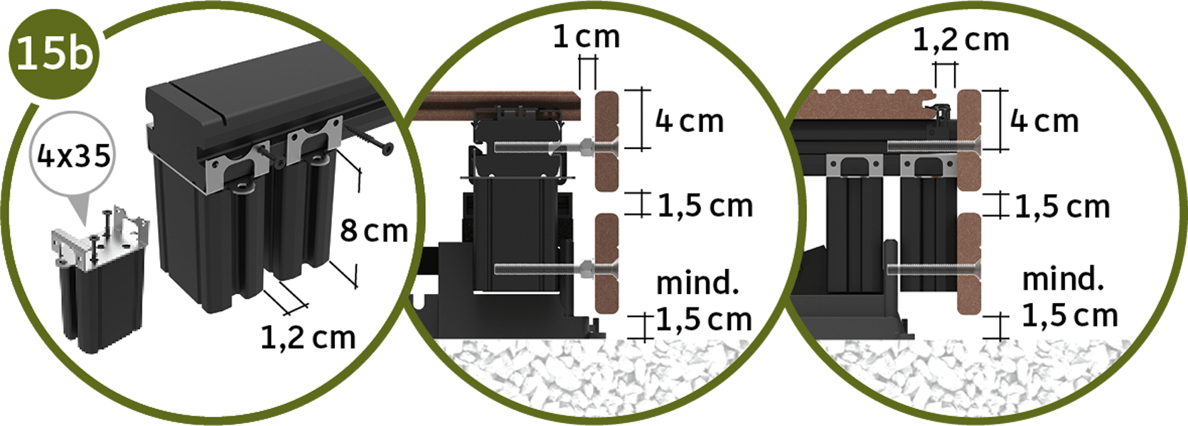 - Randclip zur Dielenbefestigung bündig am Ende der Konstruktions- balken verschrauben.