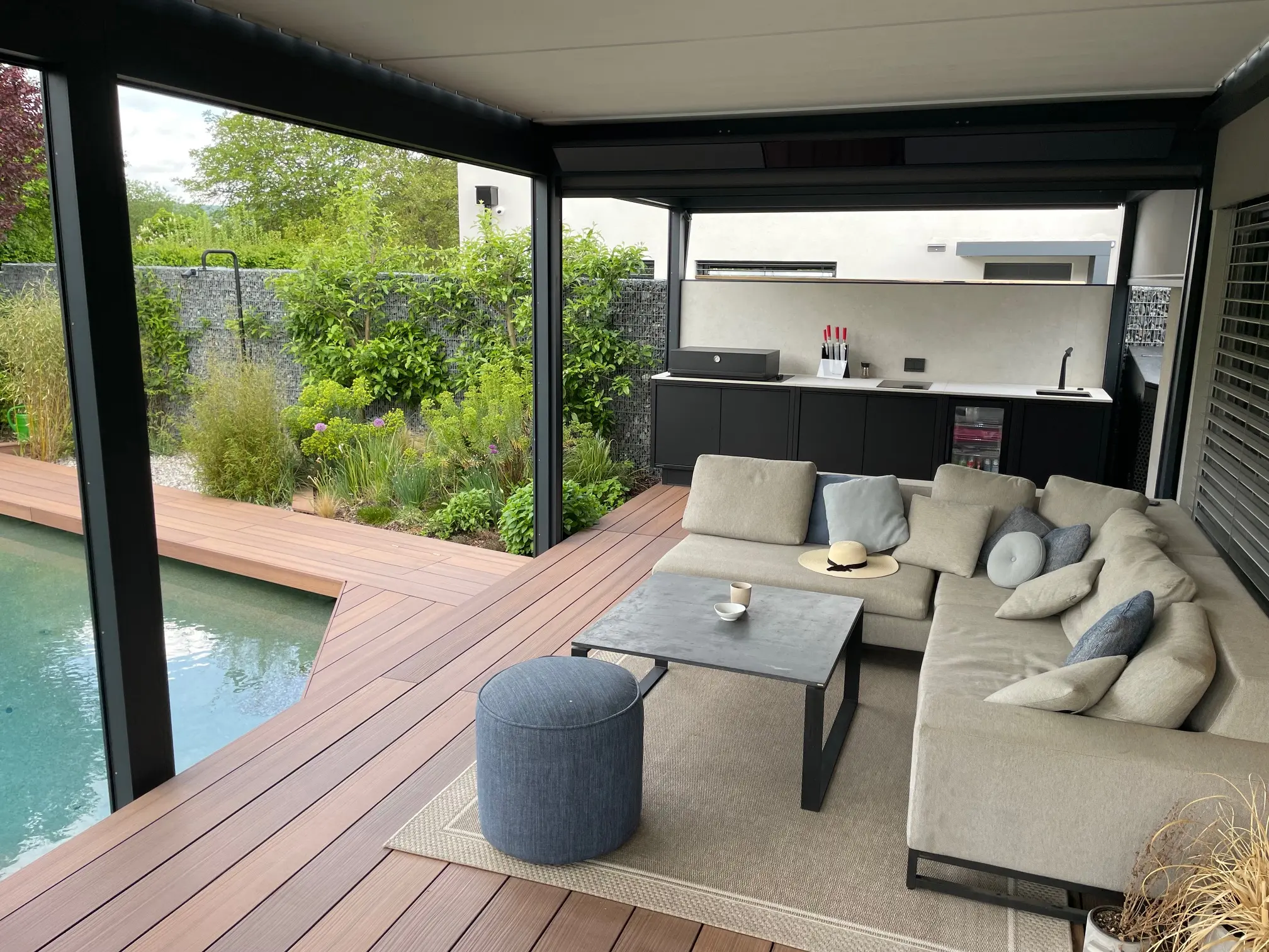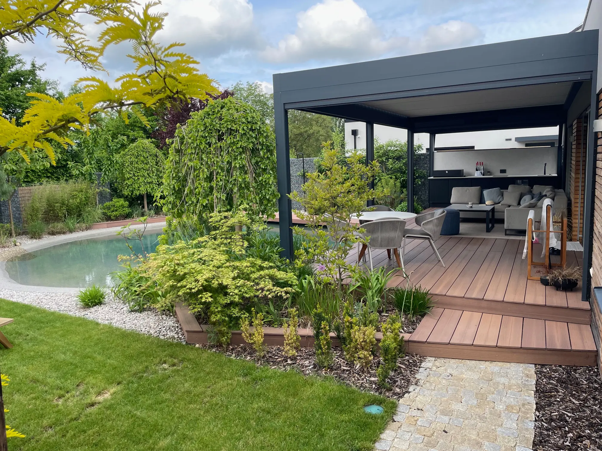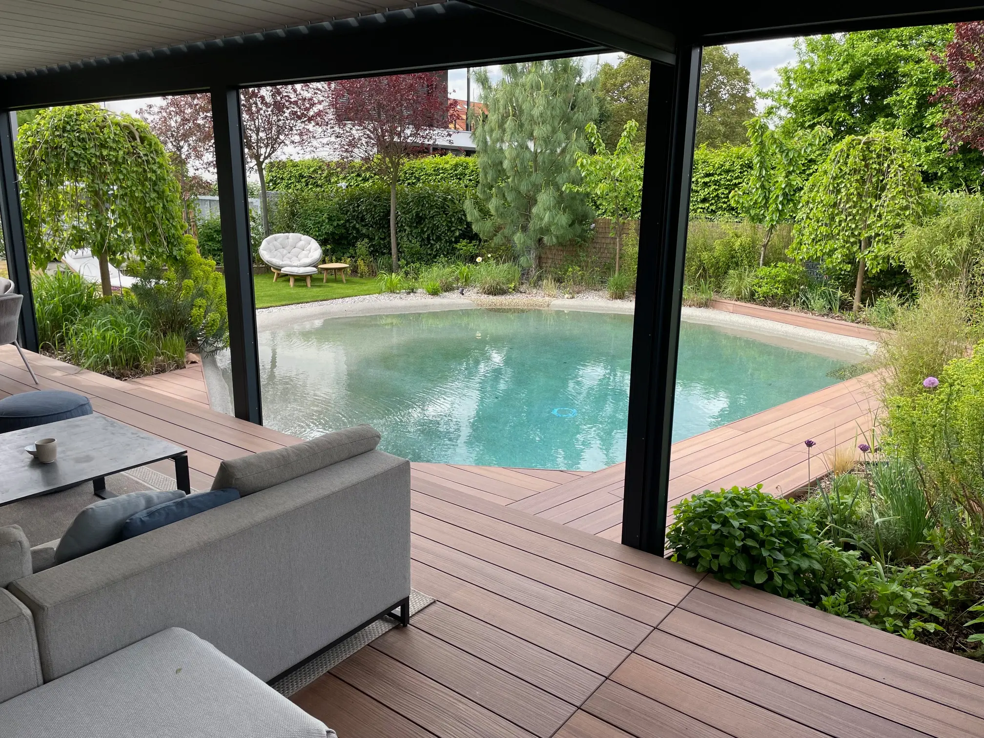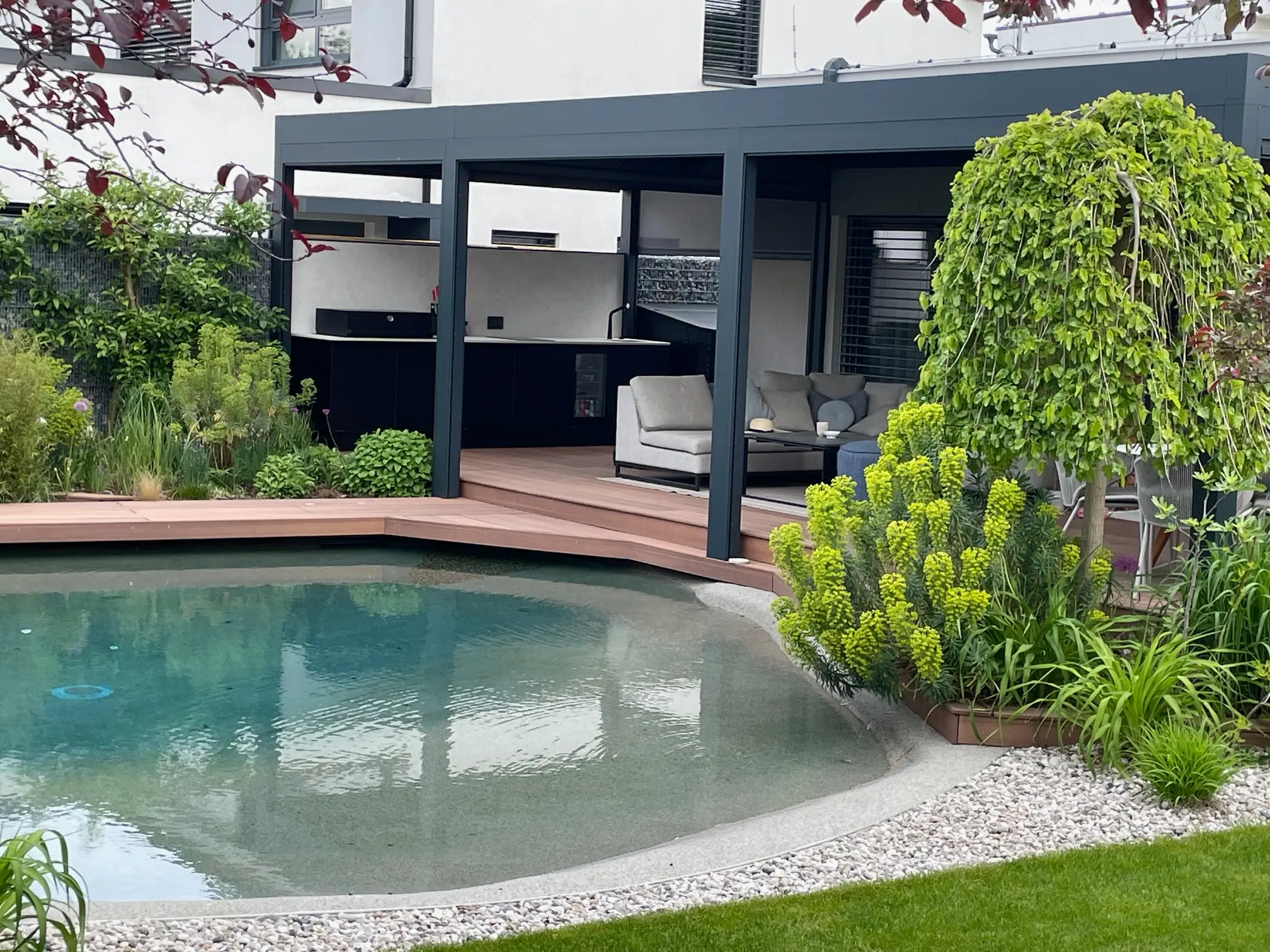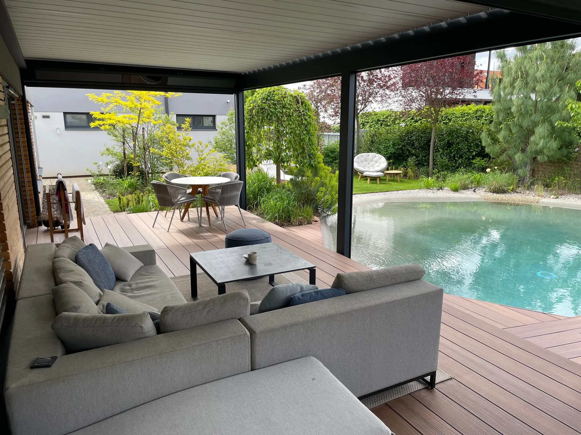 Diese überdachte Terrasse wurde von einem erfahrenen megawood® Handwerker mit viel Liebe zum Detail zu einem echten Wohnraum im Freien gestaltet. Die gemütliche Sitzlounge lädt zum Entspannen mit Blick auf den idyllischen Teich ein, während der liebevoll angelegte Garten die harmonische Atmosphäre perfekt abrundet.