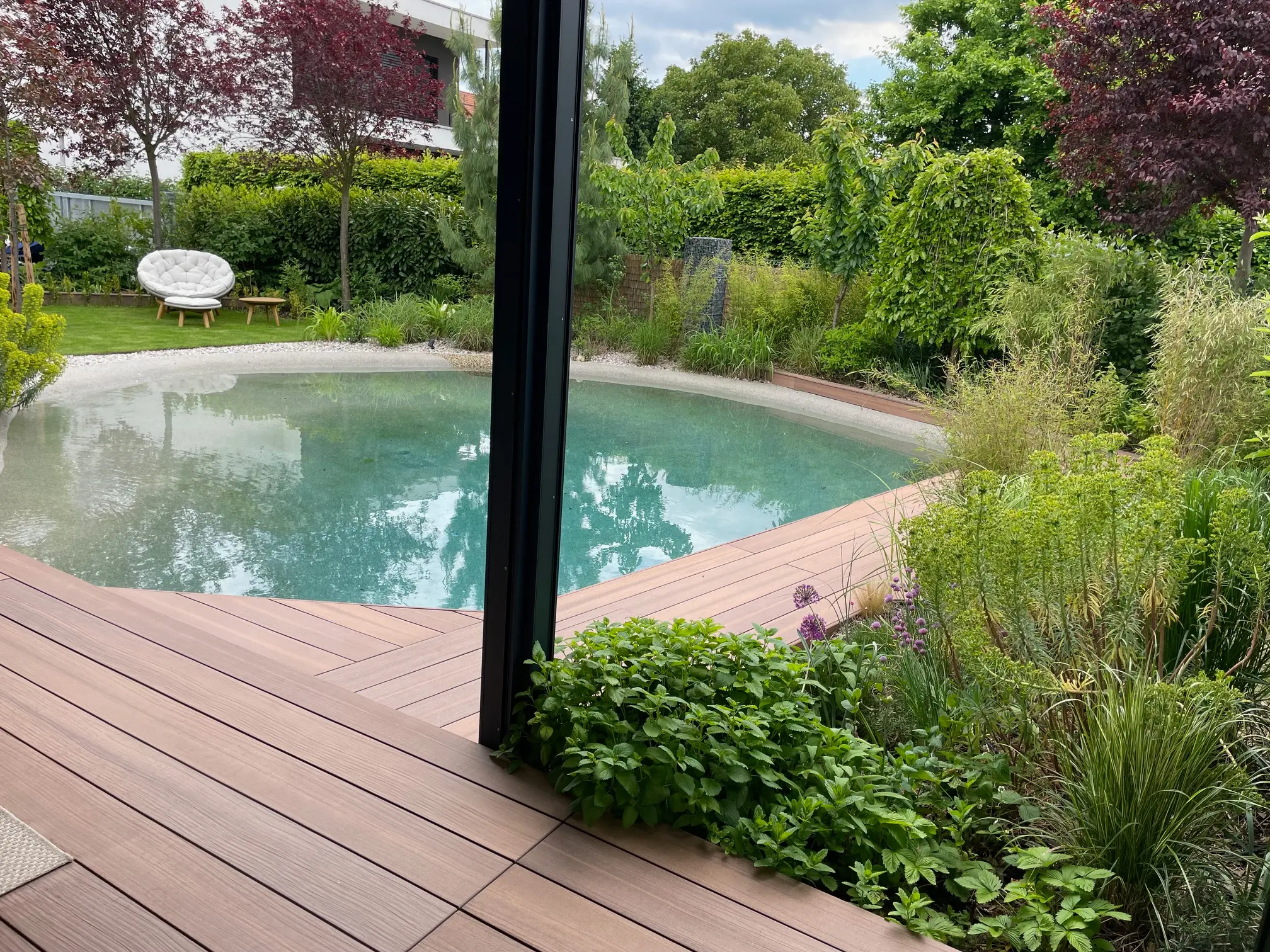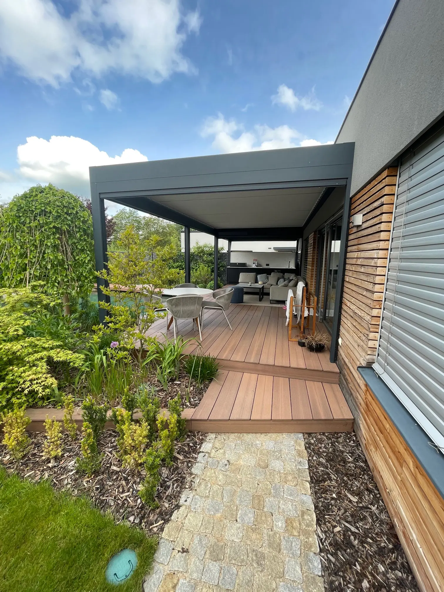 Die Signum Terrassendielen im Farbton Muskat begeistert durch ihre warme, natürliche Holzoptik und überzeugt zugleich mit höchster Qualität: splitterfrei, pflegeleicht und dauerhaft witterungsbeständig. So steht die Erholung mit Design und Funktionalität in perfekter Balance, mitten im persönlichen Gartenparadies auf 43 m2.