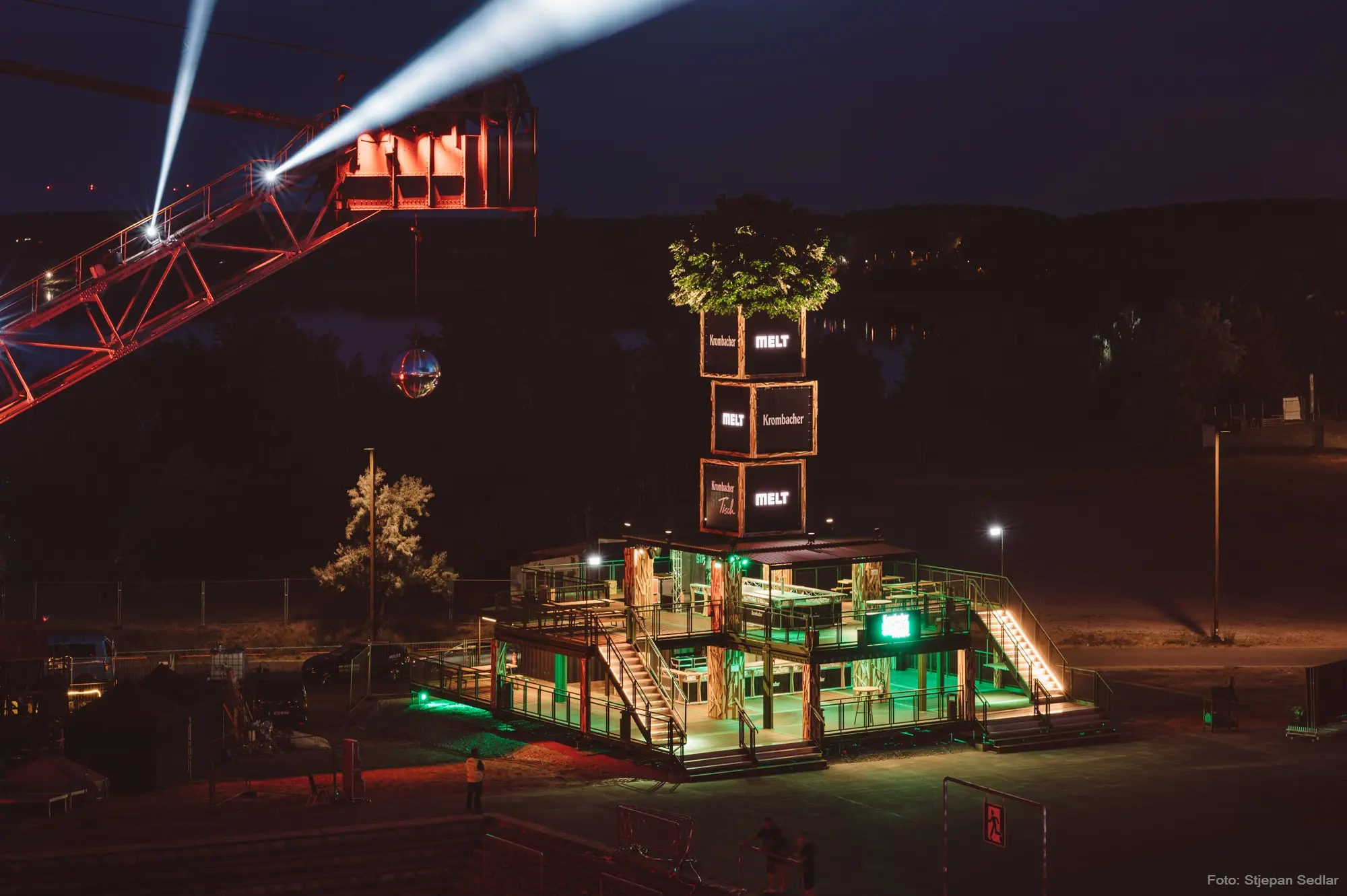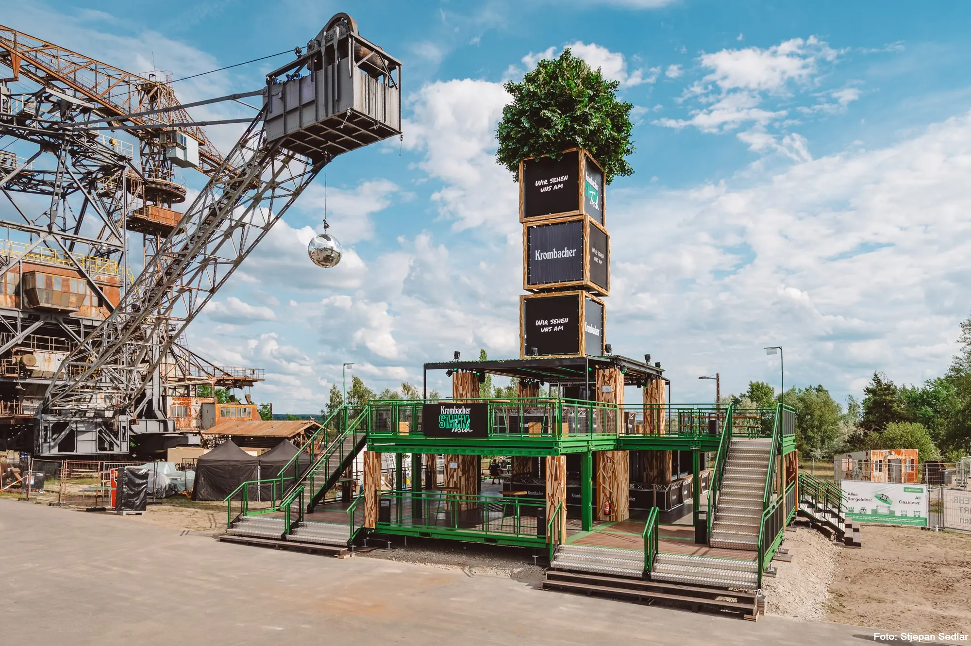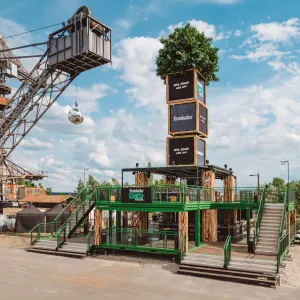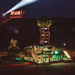 Gebaut wurde das Modul aus 20 Fuß Seecontainern und umfasst eine Gesamtfläche von rund 390 qm. Auf zwei Ebenen gibt es Bars, Sitzmöglichkeiten, ein DJ Pult und eine Tanzfläche. Der ca. 17 Meter hohe „Stammbaum“ mit LED-Panels und einer täuschend echten Baumkrone machen ihn zum unübersehbaren und einzigartigen Hotspot bei Veranstaltungen.