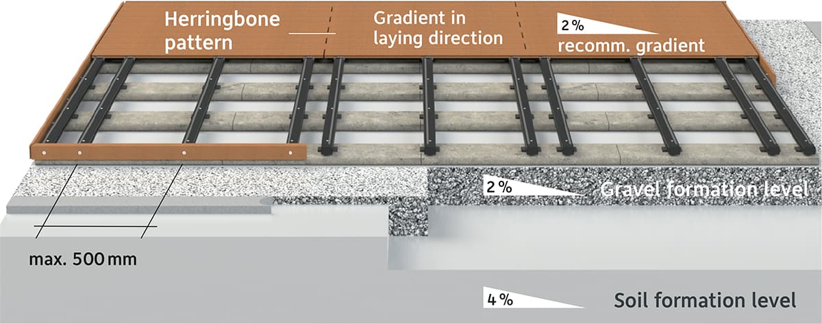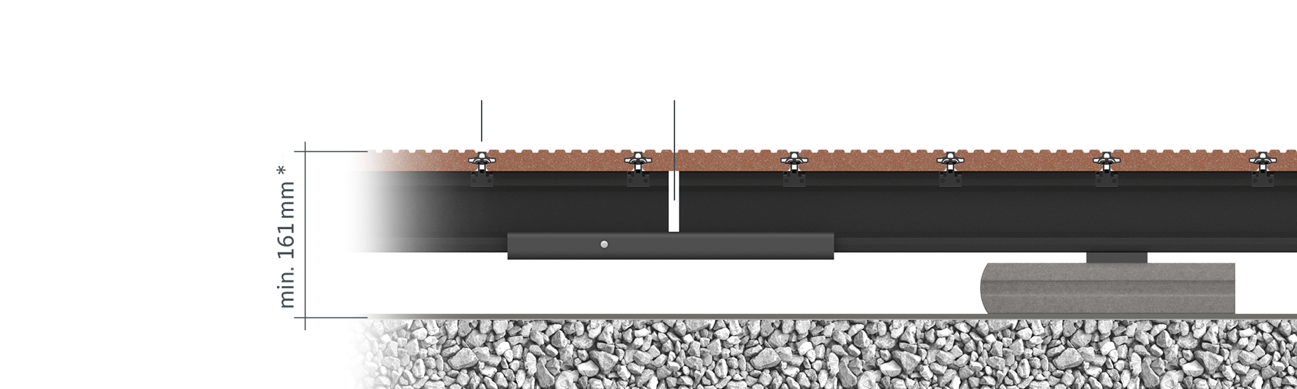 • The ground-level deck can be designed with a closed gap if the construction height of 161 mm or more, a minimum longitudinal slope of 2% and a circumferential ventilation grille or other structural measures for sufficient under- or rear-ventilation are strictly adhered to.