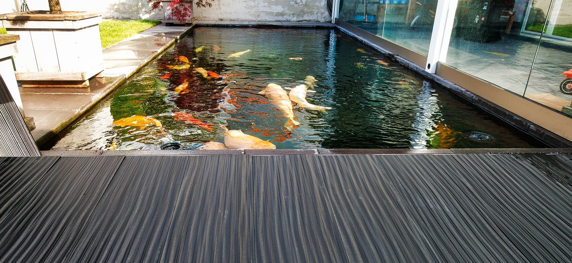 „Due anni fa ho visto nella rivista megawood® la tavola DYNUM nel colore Nigella “, racconta Roggisch. Da allora la tavola fa da copertura al filtro a spazzola dell’appassionato di Koi – test di