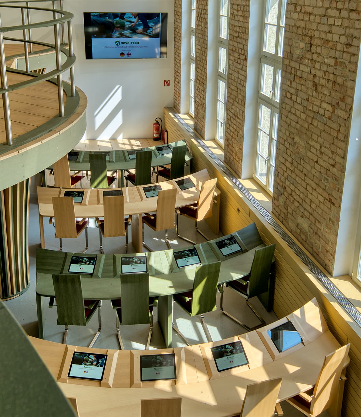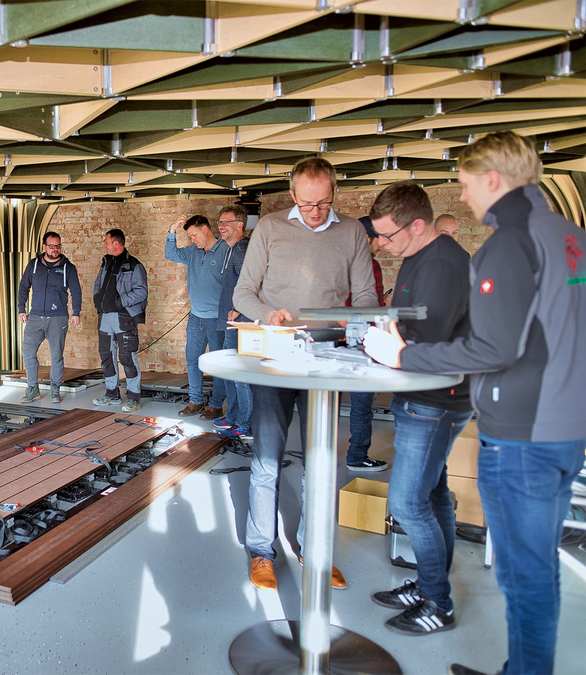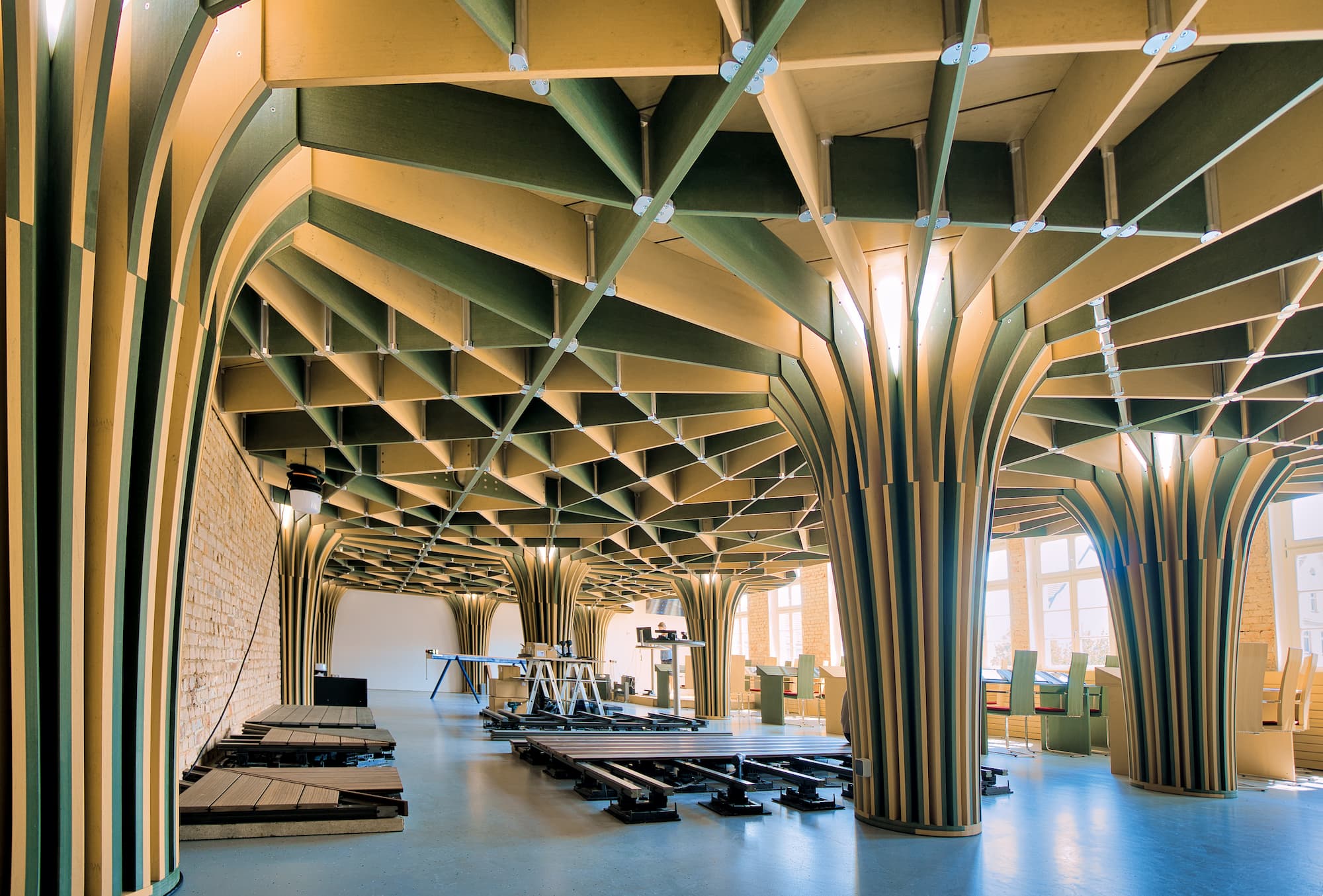 Vernieuwingen zijn er heel wat! Indrukwekkende expressie van de veelzijdigheid van het materiaal en van de statische eigenschappen daarvan is de waaierconstructie in het seminargebouw dat de deelnemers aan de opleidingen letterlijk op een heel nieuw niveau brengt.