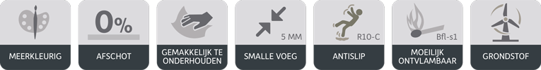 Oppervlakte: eenzijdig legbaar, gematteerd-gestructureerd oppervlak met kleurverloop*, 5 mm voeg